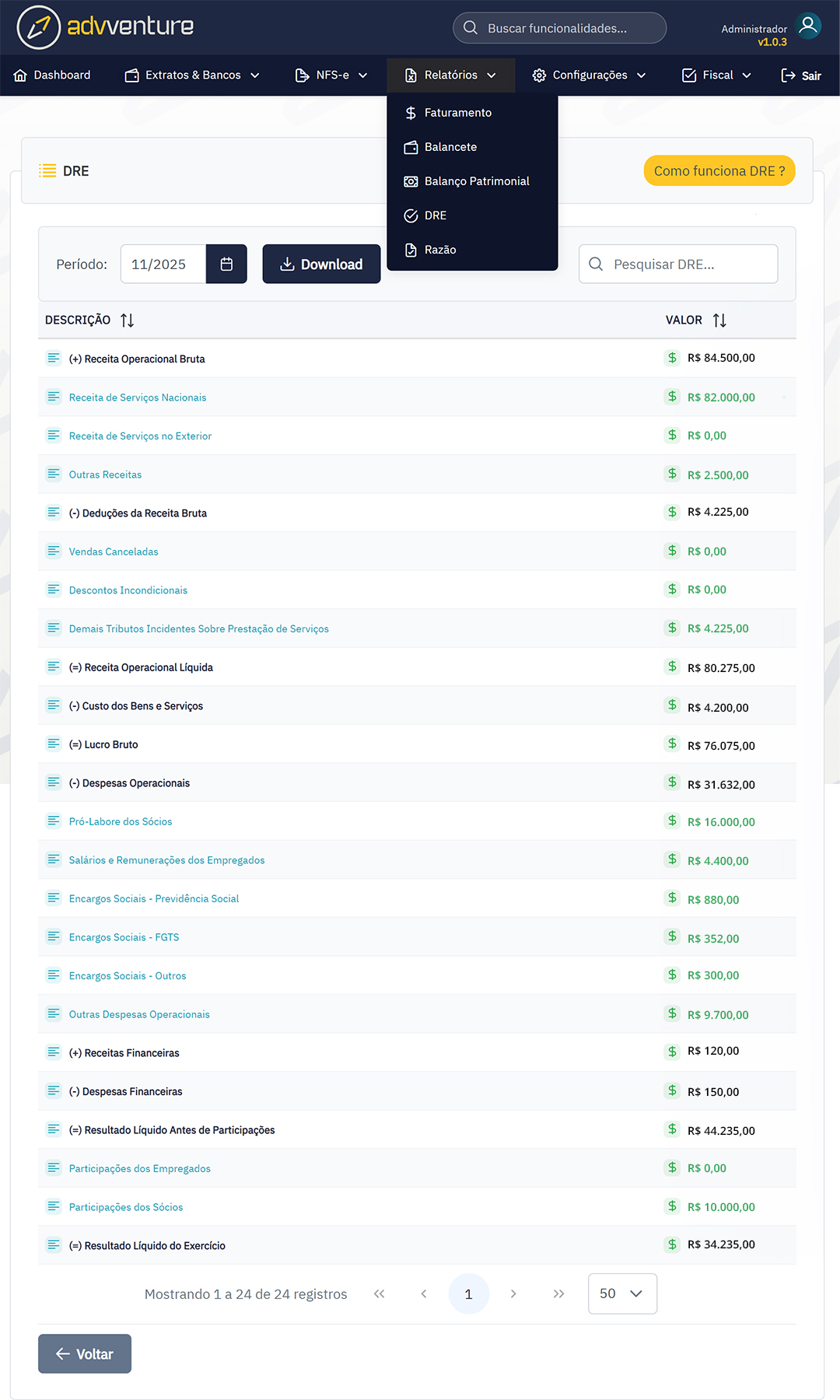 - Relatórios automáticos: DRE, Balanço Patrimonial, Balancete e Faturamento.